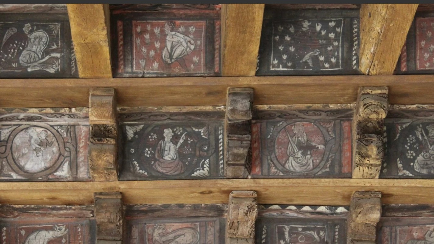 The most fascinating feature that makes the bestiary unique is the larch wood ceiling, which is decorated with 300 surviving painted panels, out of an original 1,200.
