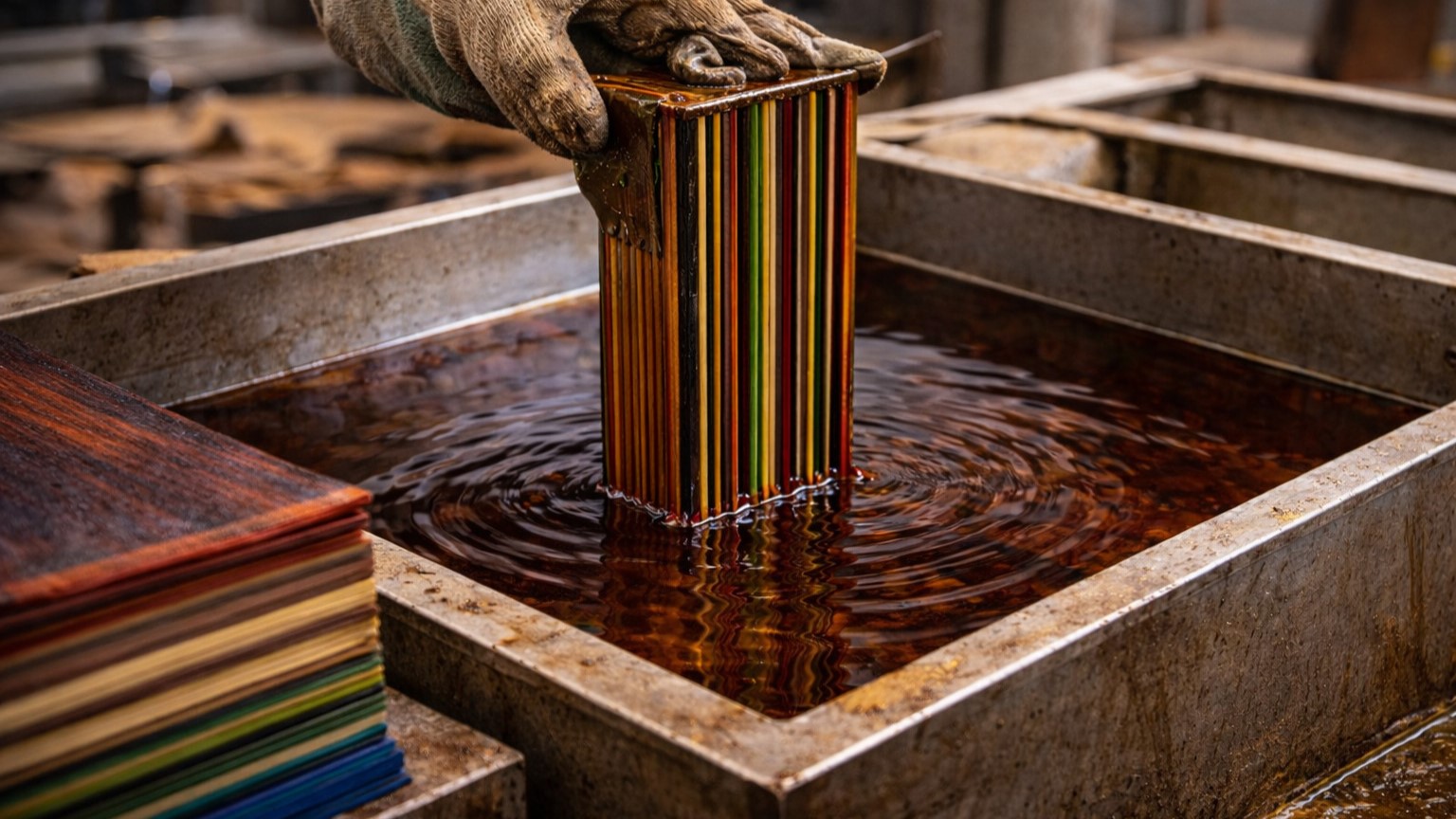 The wood sheets are soaked in phenolic or epoxy resin. The resin penetrates deep into the wood fibers, strengthening them.