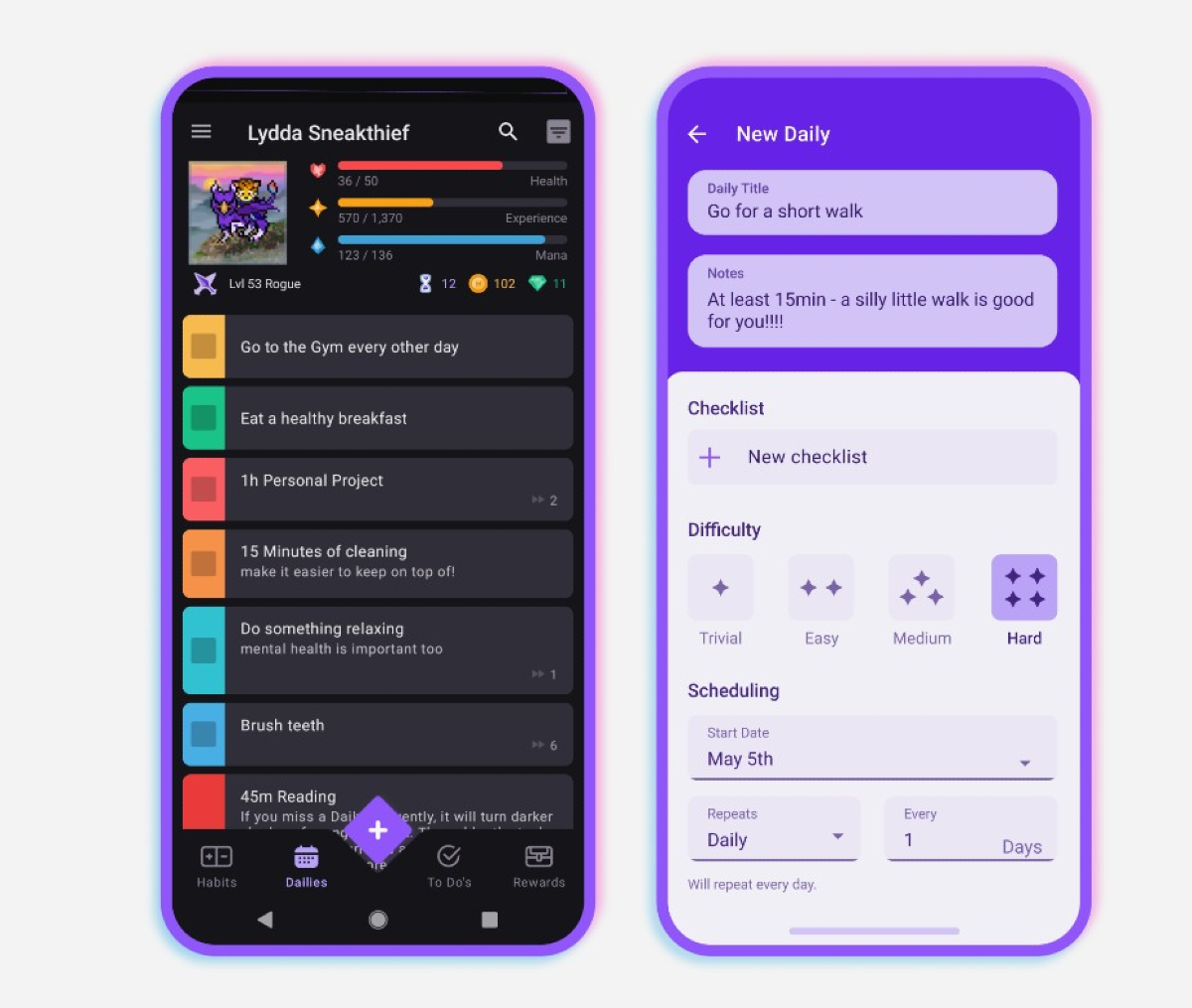 Habitica: This app helps to transform your daily habits and to-do lists into an old school role playing game. When you finish your pending tasks, you earn a gold badge, leveling up your avatar and unlocking cool gear. But once you miss a habit, your avatar starts losing its health.
